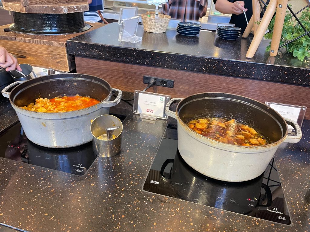左が卵料理で、オムレツか明石焼き風オムレツから選べて、明石焼き風オムレツを選びました。お出汁がさっぱりしていて、美味しいです!