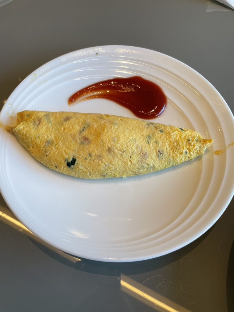 こちらはオムレツです。(トッピングは蒸し鶏、ほうれん草、トマト、オニオンにしました。)