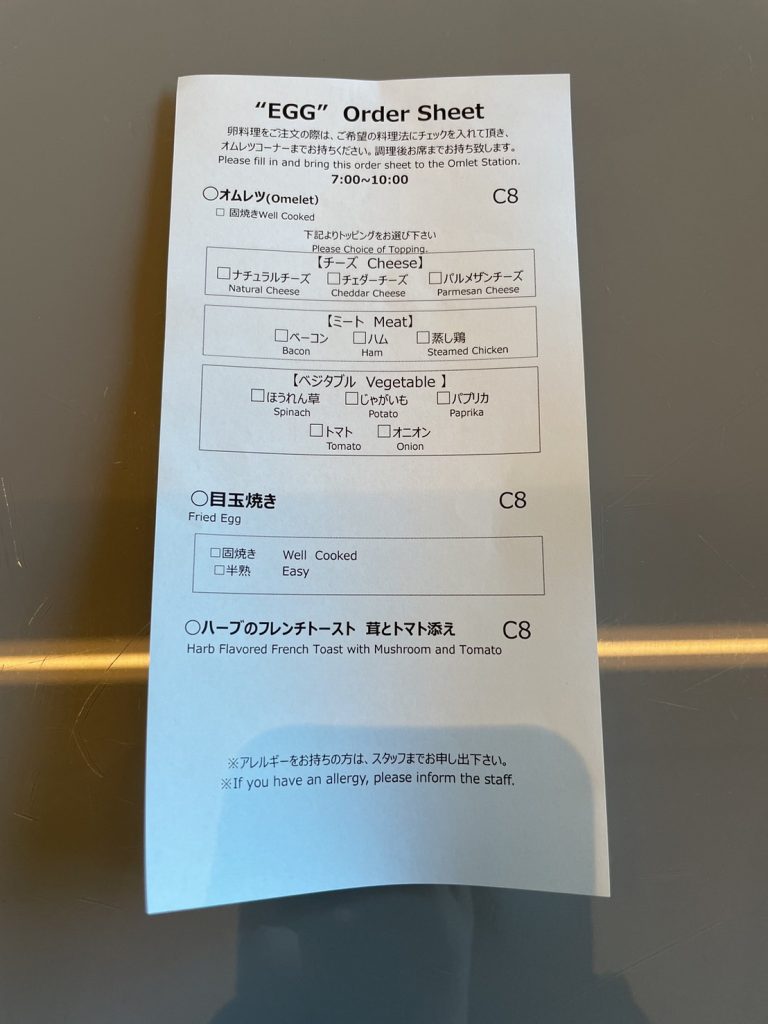 卵料理は、テーブルでオーダーシートに記載してオムレツコーナーまで持っていくスタイルです。出来次第、席まで持ってきていただけます。