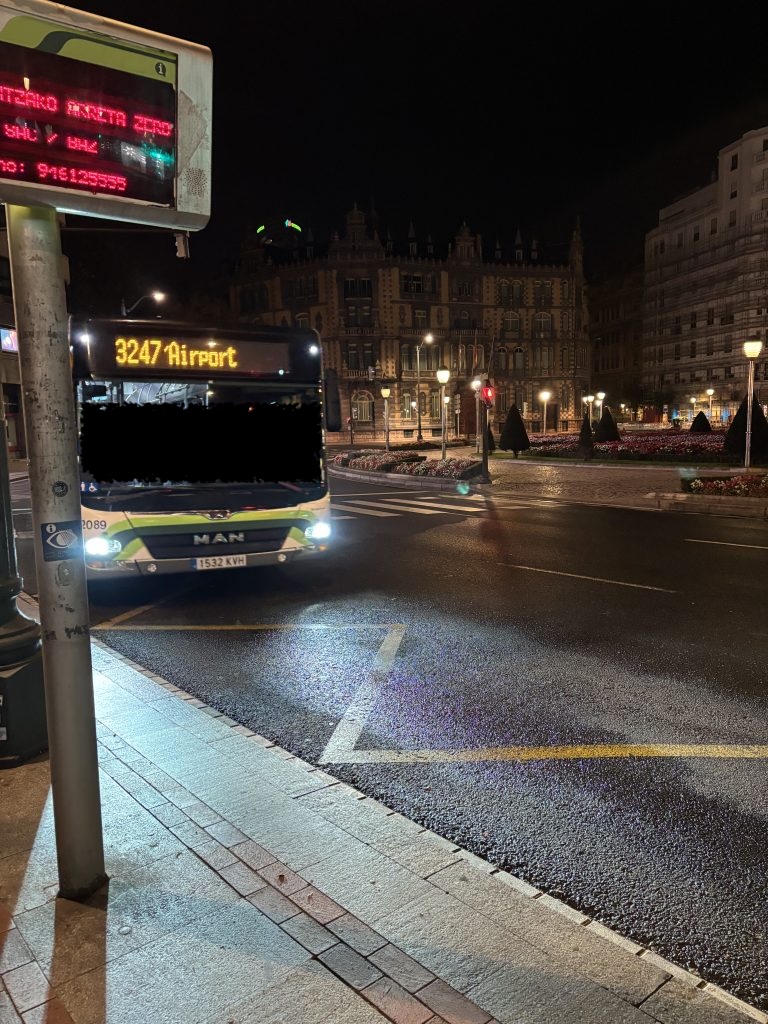 まずこのフライトを利用するにあたって非常に悩んだのが移動手段です。ビルバオ市内から空港行きの始発バスはバスターミナルを午前5時発。モユア広場の乗り場を午前5時10分発のバスになります。