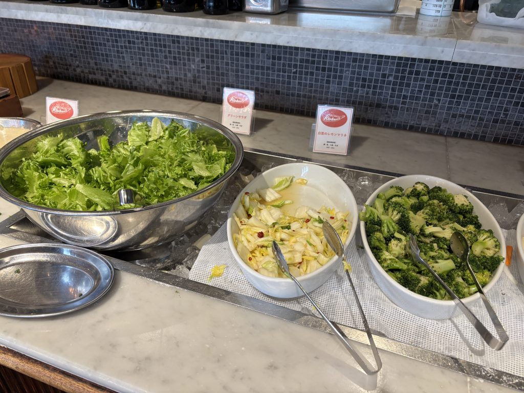 サラダバーには、新鮮な野菜がたっぷり。ドレッシングも数種類用意されているので、飽きずに色々な味を楽しむことができます。