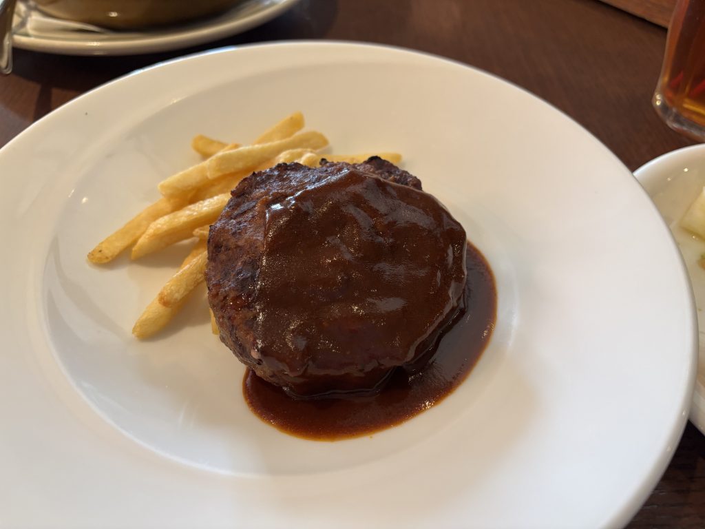 今回私が注文したのは、ビーフハンバーグのランチ。ナイフを入れた瞬間、肉汁がジュワッとあふれ出し、食欲をそそります。