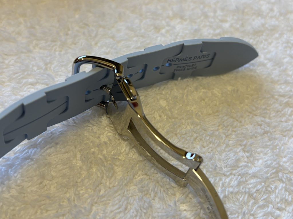- 着脱のしやすいディプロイアントバックル: まず、耐水性の高いソフトな成形ラバーのため、日常生活においてもバンドへのダメージを気にすることなく生活ができます。また、外す時はワンクリックで、着用の時もカチッとはめるだけという着脱のしやすさが本当に便利です。