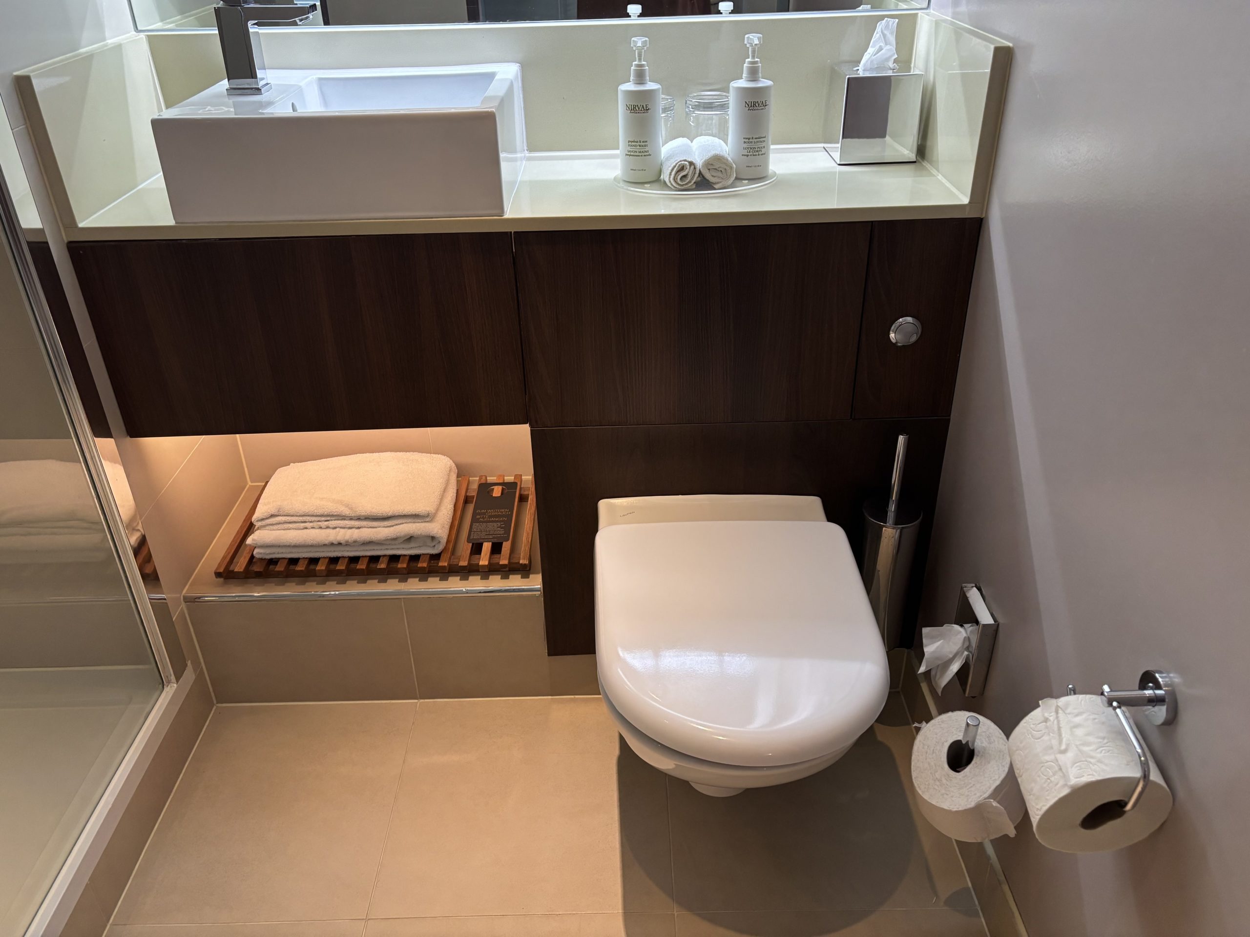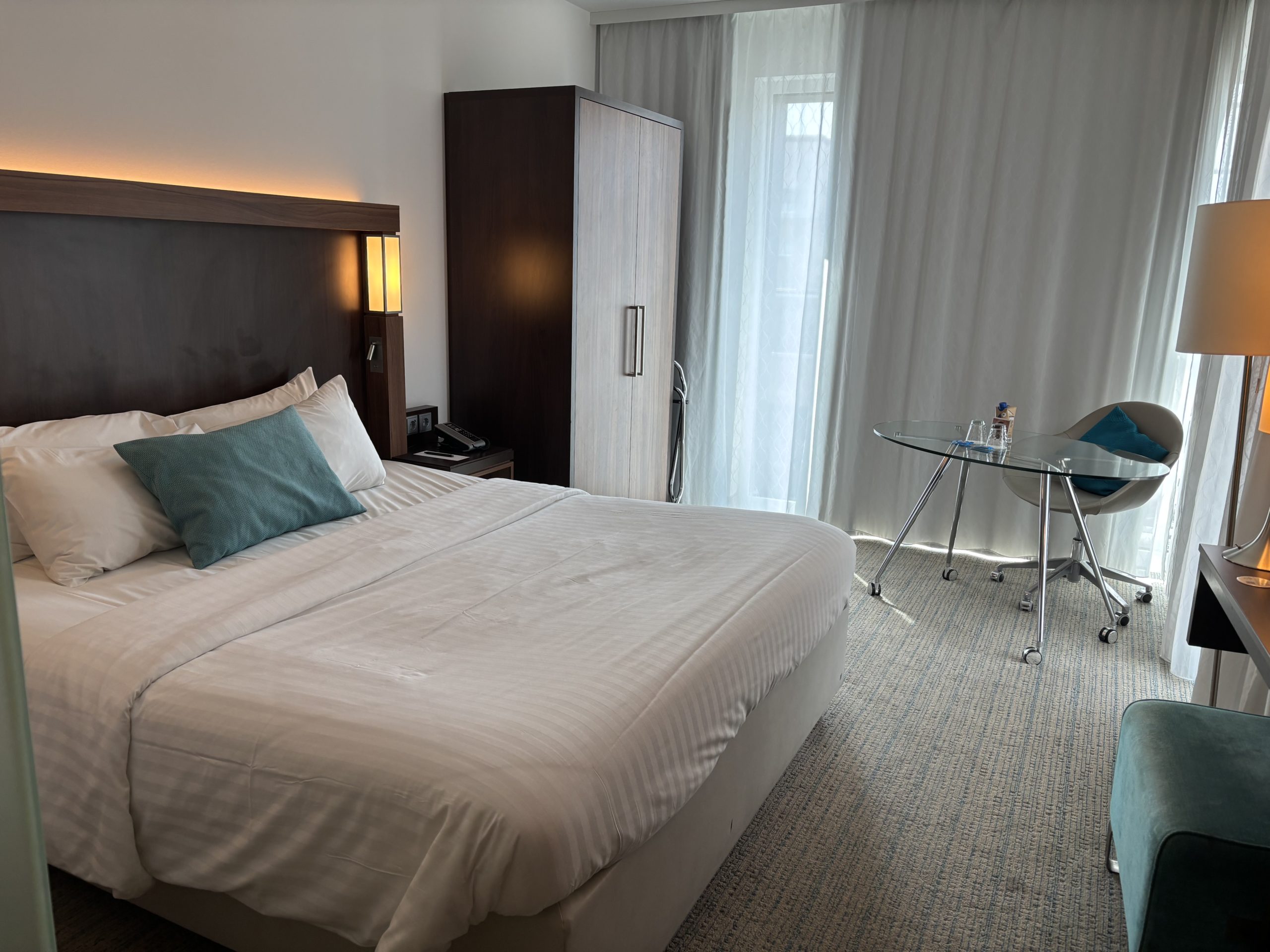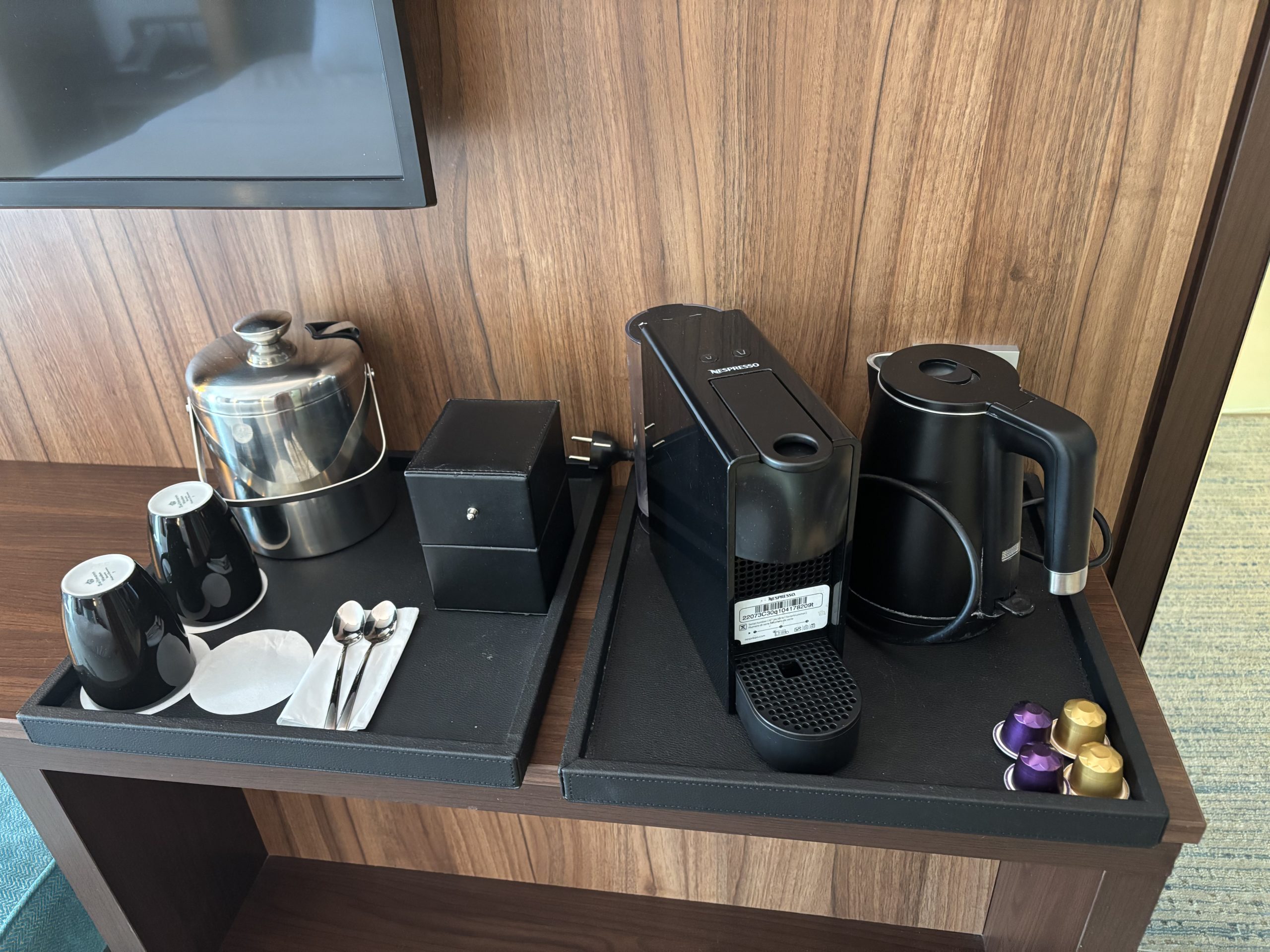 チェックインを済ませ、早速お部屋へ。客室はモダンで落ち着いた色調でまとめられており、とてもリラックスできる空間でした。広々としたデスクもあり、出張でPC作業をするのにも便利そうです。