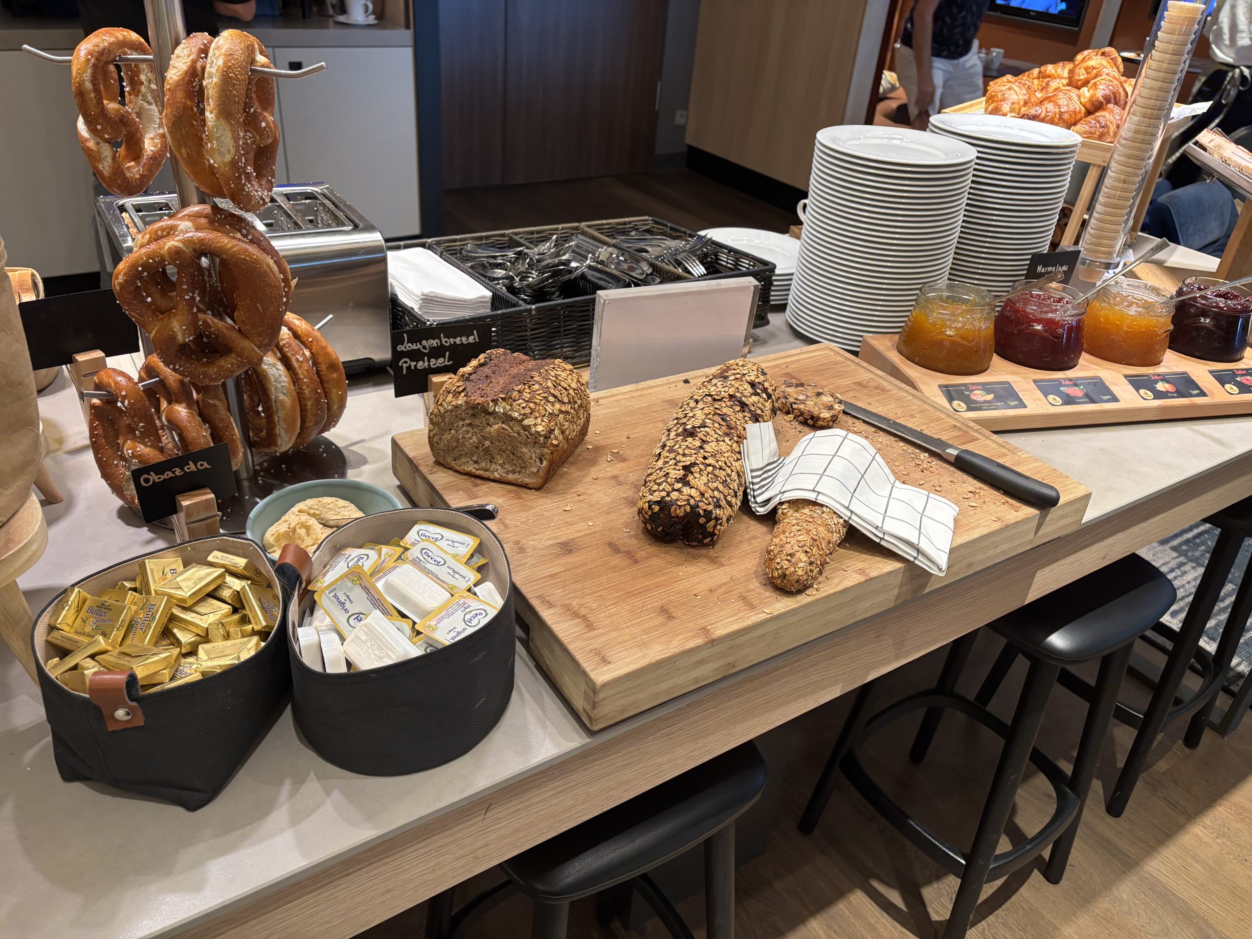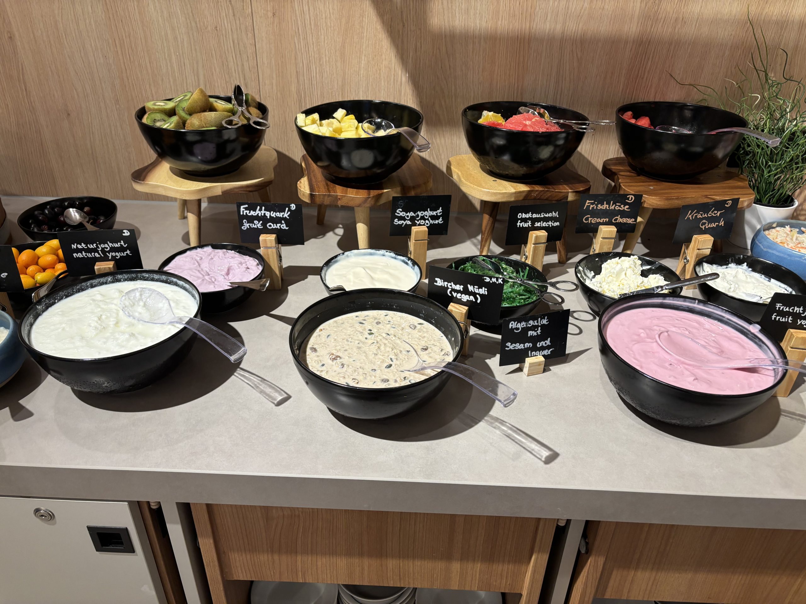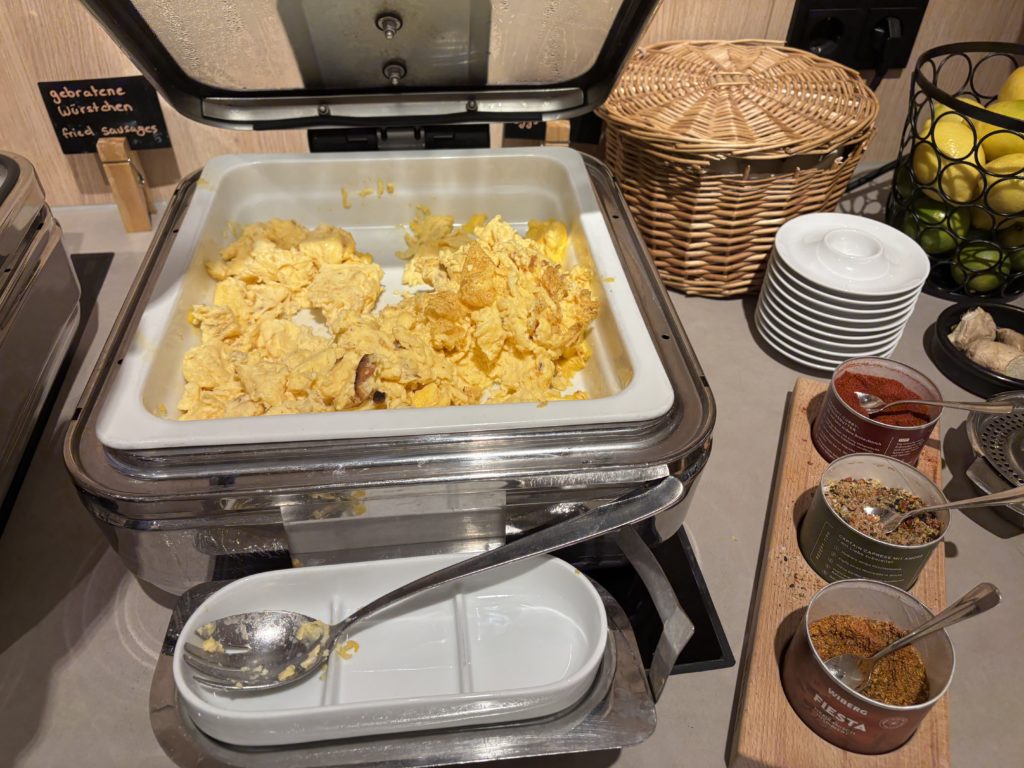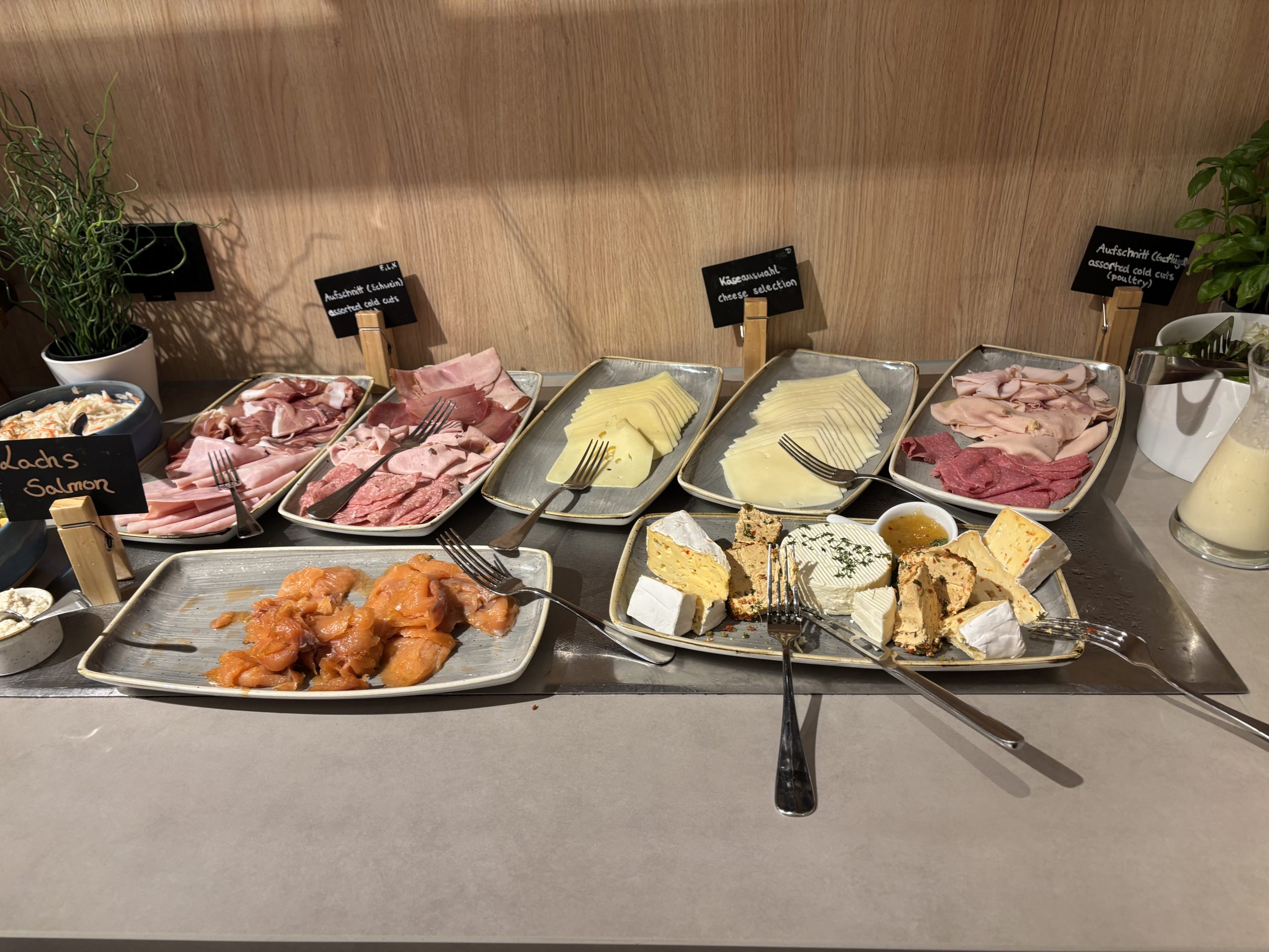 レストラン「K&B」で提供されるビュッフェ形式の朝食は、種類が豊富でどれも美味しそうでした。温かい料理はもちろん、ハムやチーズ、フレッシュなフルーツやヨーグルト、そしてドイツパンのラインナップが充実しており、目移りしてしまいます。