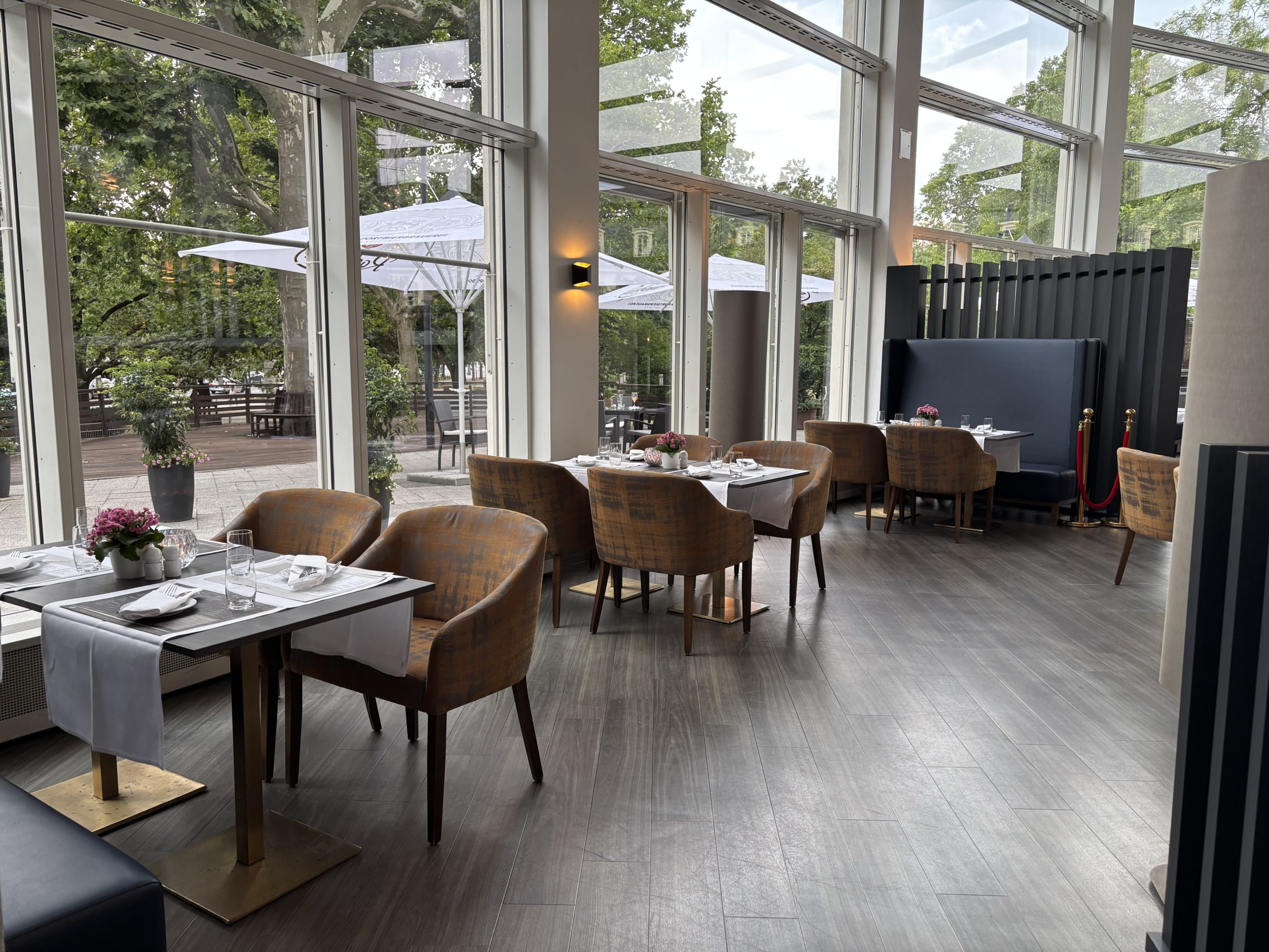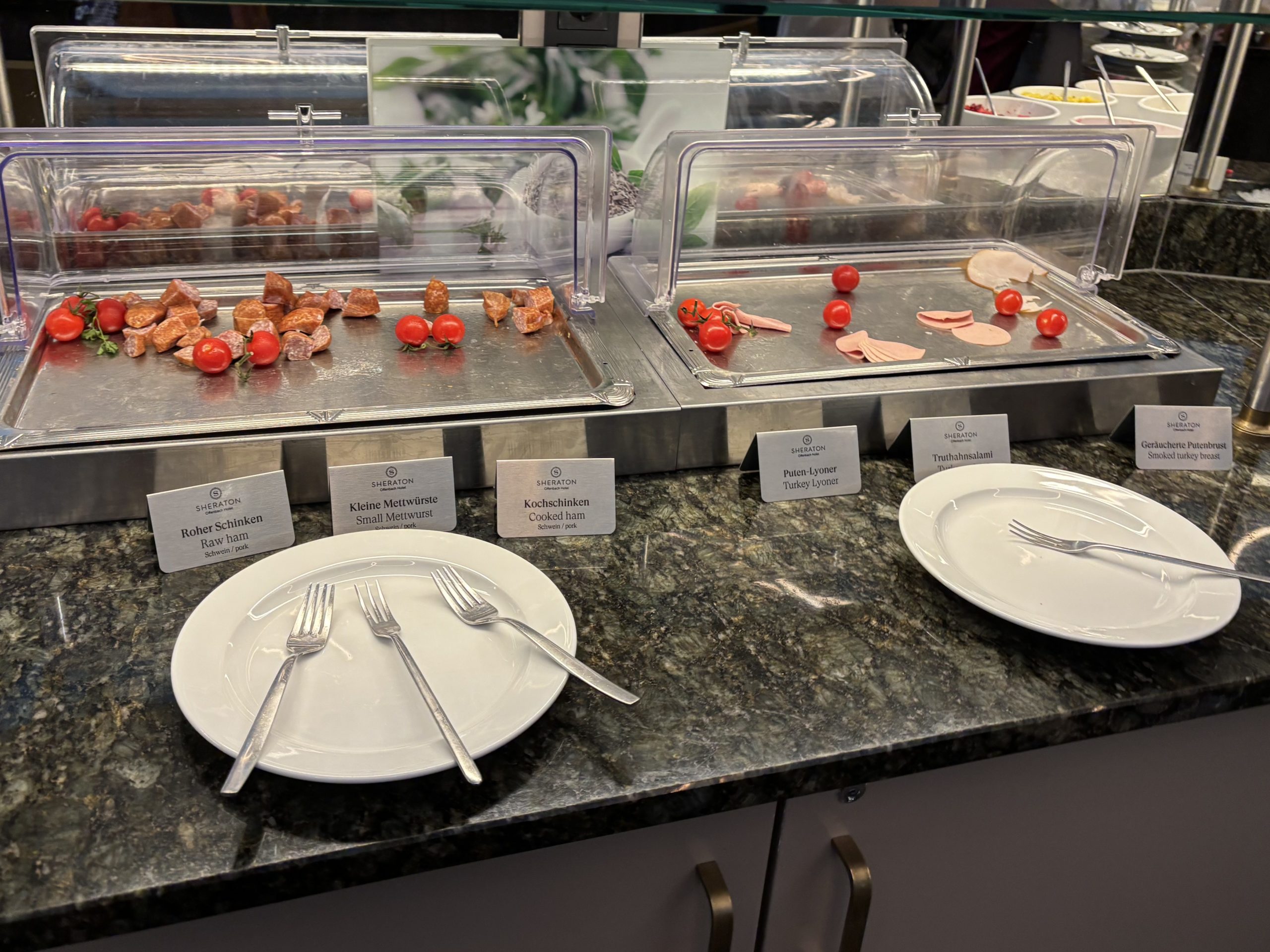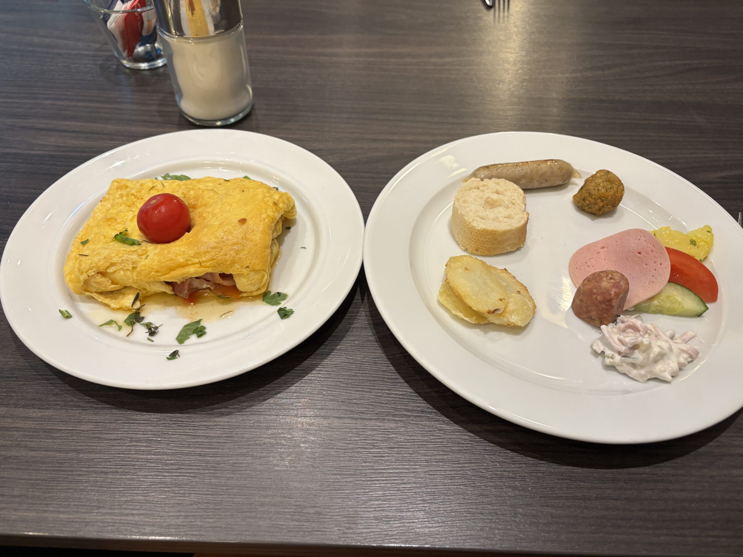 レストランは天井が高く開放的な雰囲気で、とても気持ちの良い朝を迎えられました。ビュッフェ形式で、ホットミール、コールドミール、パン、フルーツなど、種類も豊富でした。ドイツならではのソーセージやハムもあり、どれもとても美味しかったです!
