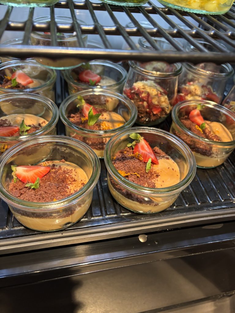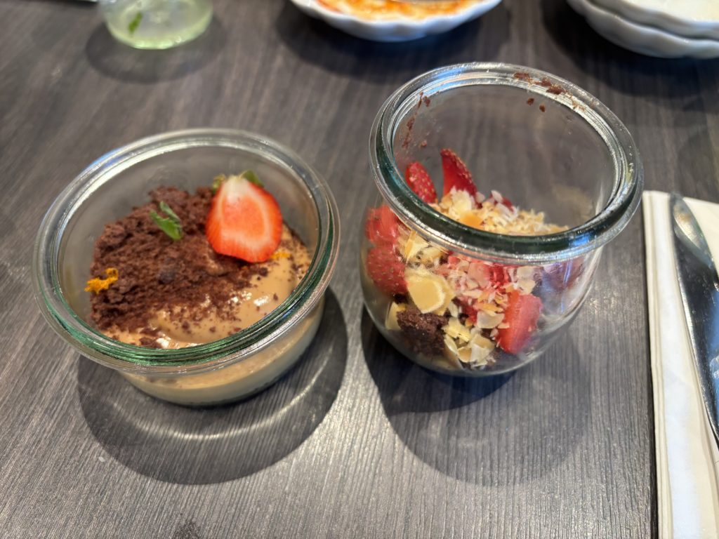 デザートです。左の高さの低いものがキャラメルプリン、右奥の高さの高いものがチョコレートムースです。どちらにもガトーショコラのようなものが入っていて、それがとても美味しかったです!
